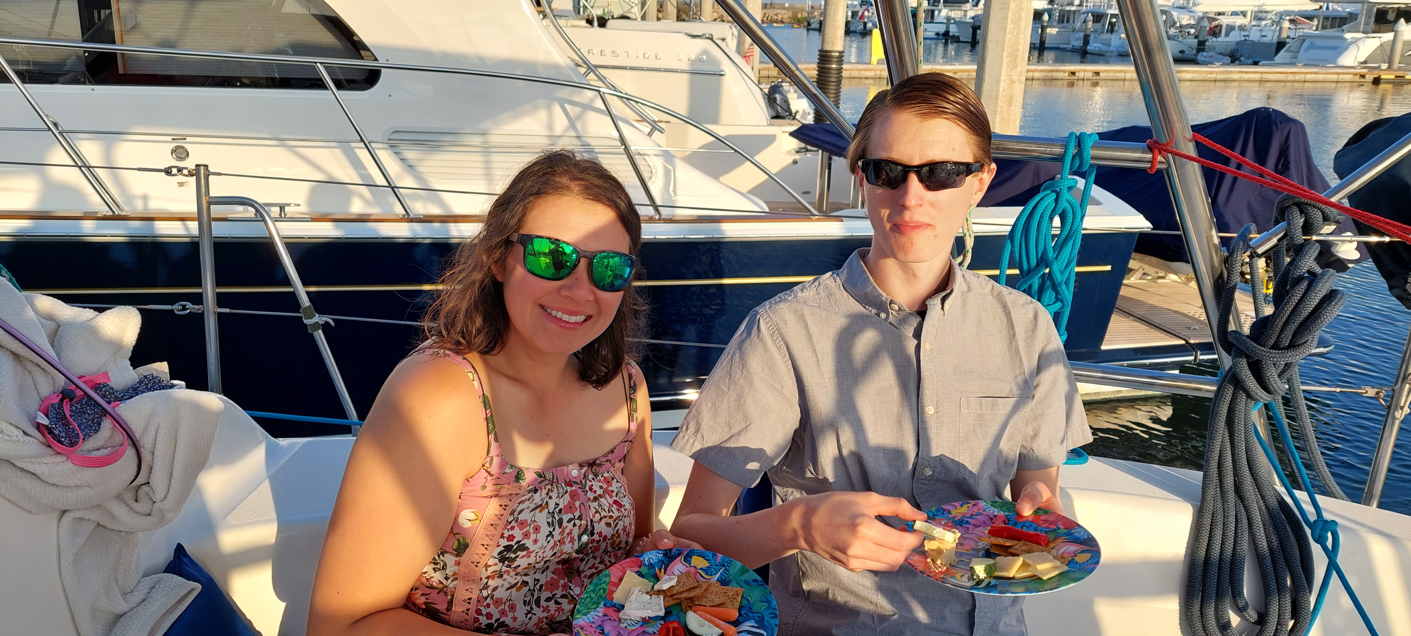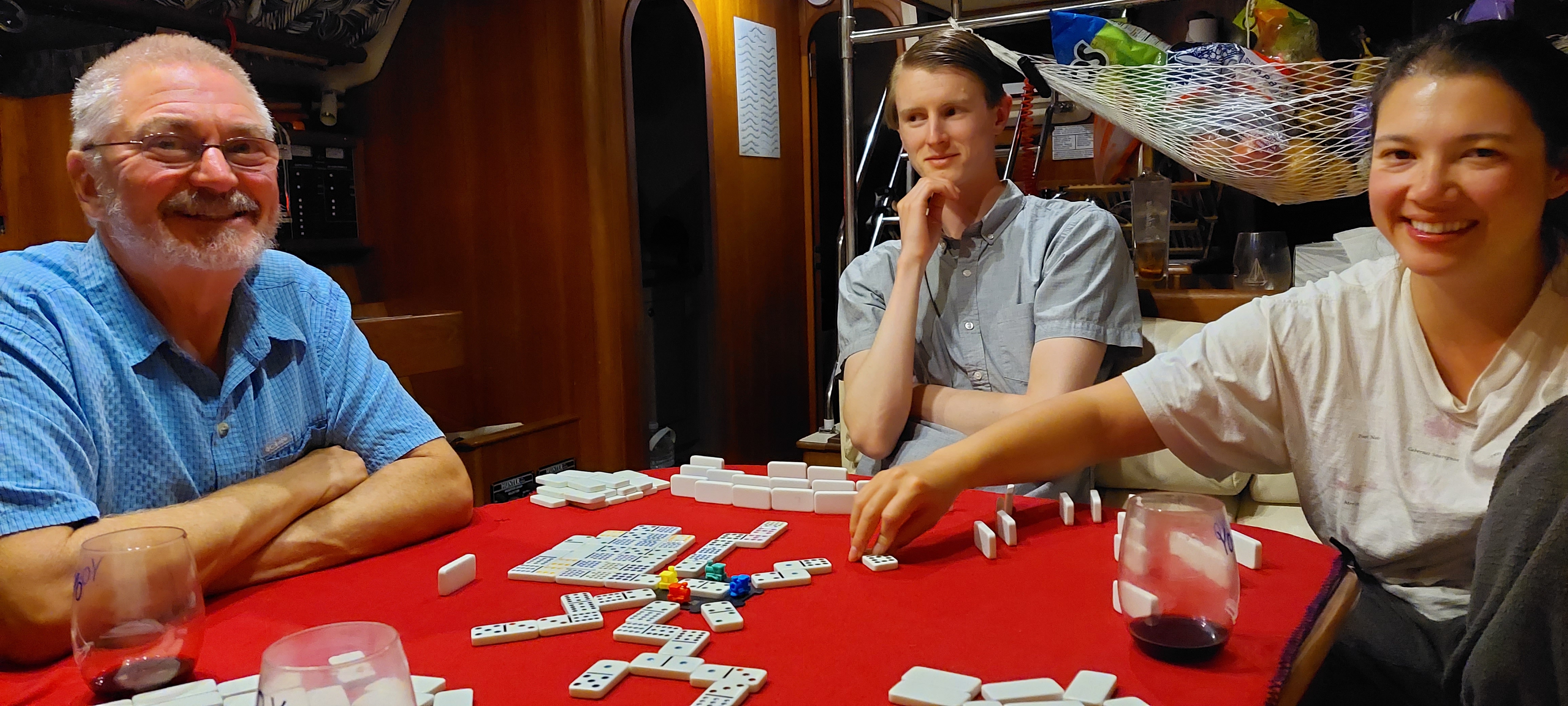 July 10, 2021 we were able to get a slip. I was very thankful. Once we were docked, showers were the primary goal. Then a walk on the beach of course to welcome solid ground. We came back to the boat for a glass of wine and appetizers before dinner. Sadly not the best atmosphere for dinner at Brophy Brothers. It was really loud and crowded. That did not stop our fun as we ended the night with dominoes Mexican Train. And we all won a game. Well, Dave won 2.