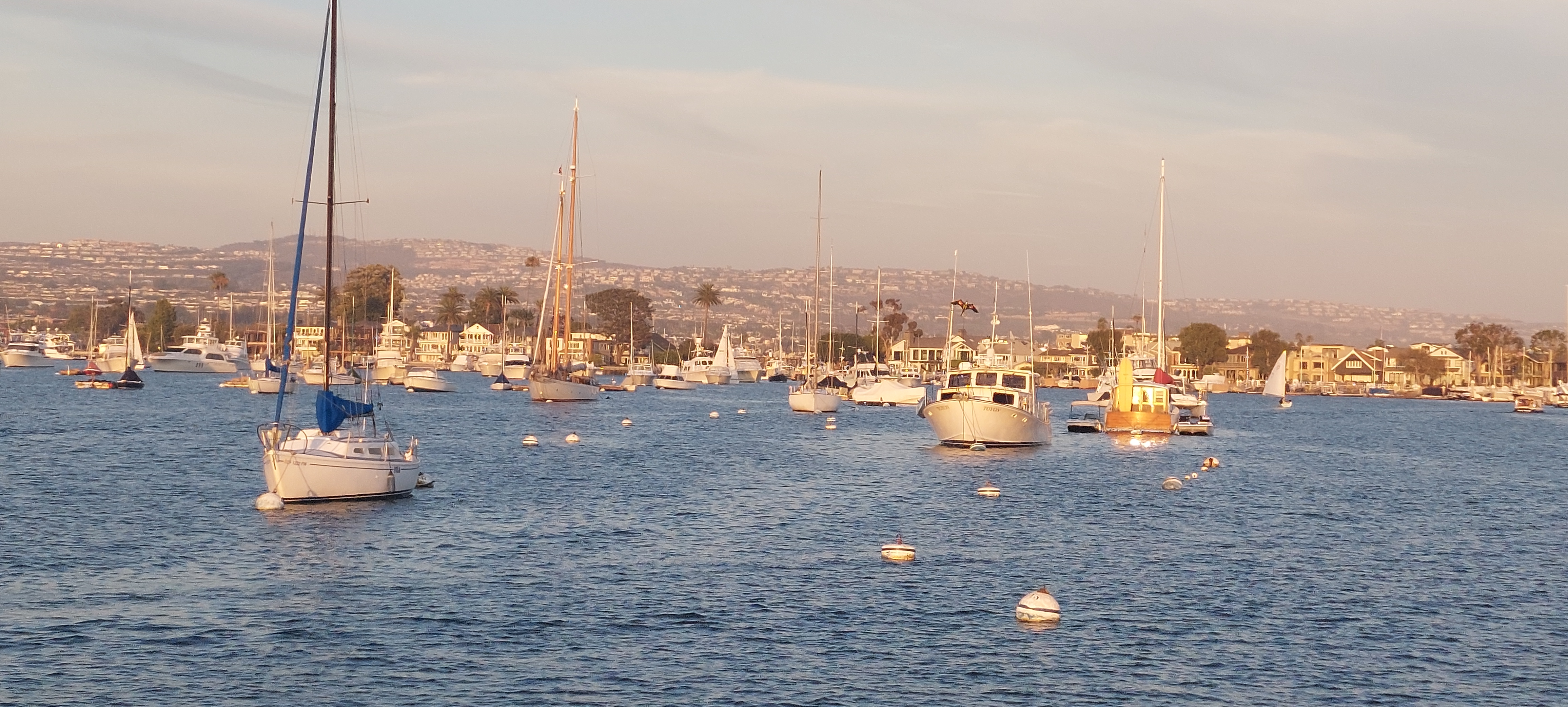 The water in Newport Harbor is not nearly as clear as we had in both anchorages at Catalina Island. Might be skipping the swim in the marina this time. Oh but there is a beach just about 400 yards west, so yep, we’ll be getting sand between our toes on our way into the surf.