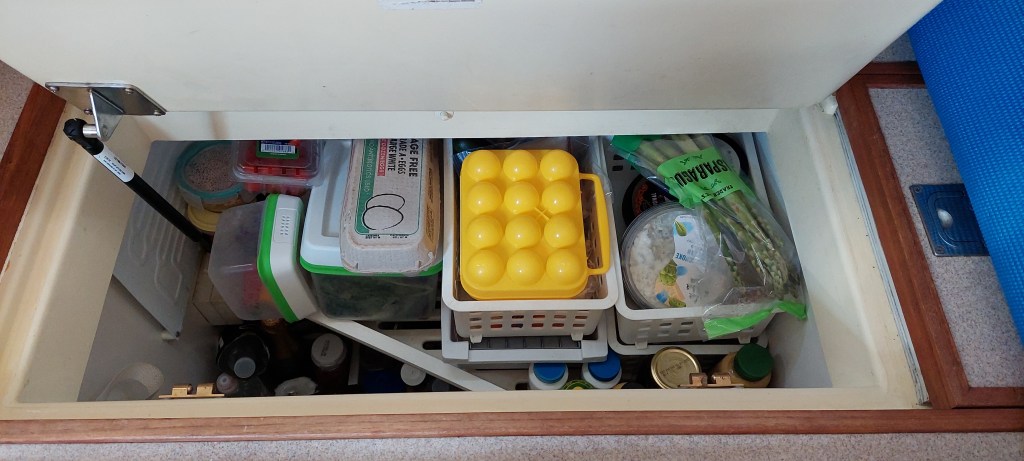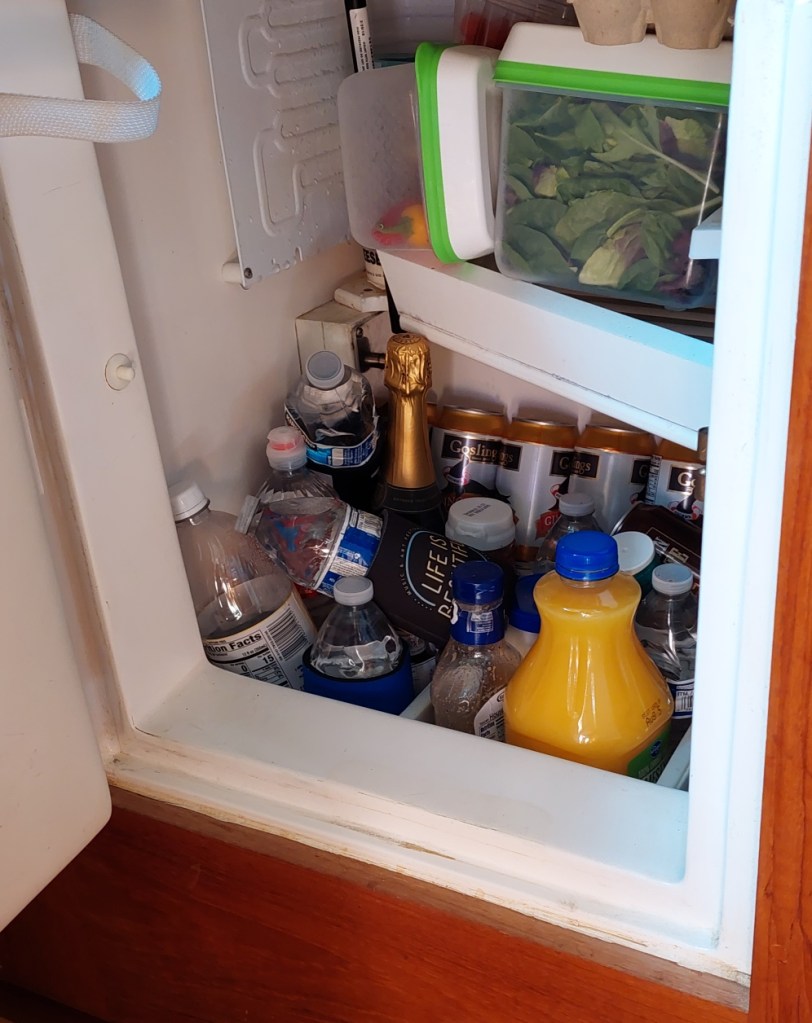 The fridge and freezer are nicely sized in sailboat terms.  We are working on how to best utilize the space.  Although it’s “sailboat big”, it’s tiny compared to what we had at home.