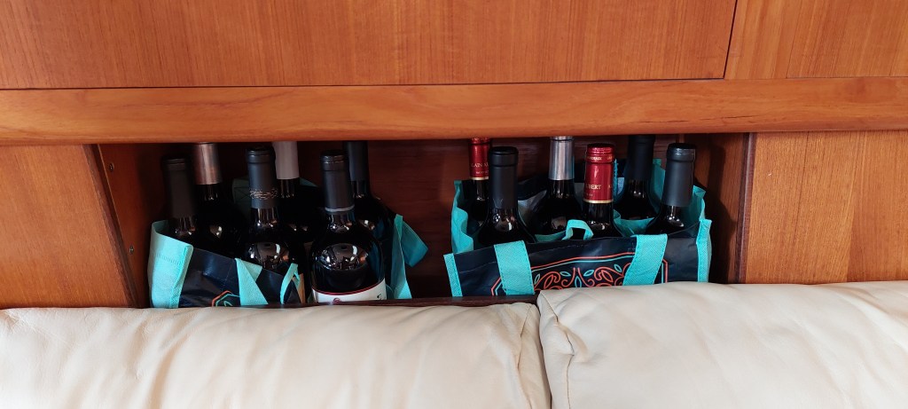 And did we mention that we like wine?  Our cellar from our Reno home has paired down a bit.  Only room for about 20 bottles on the boat at a time.  As we head south access to good wine will become more scarce and our ‘cellar’ will be reallocated to new purposes.