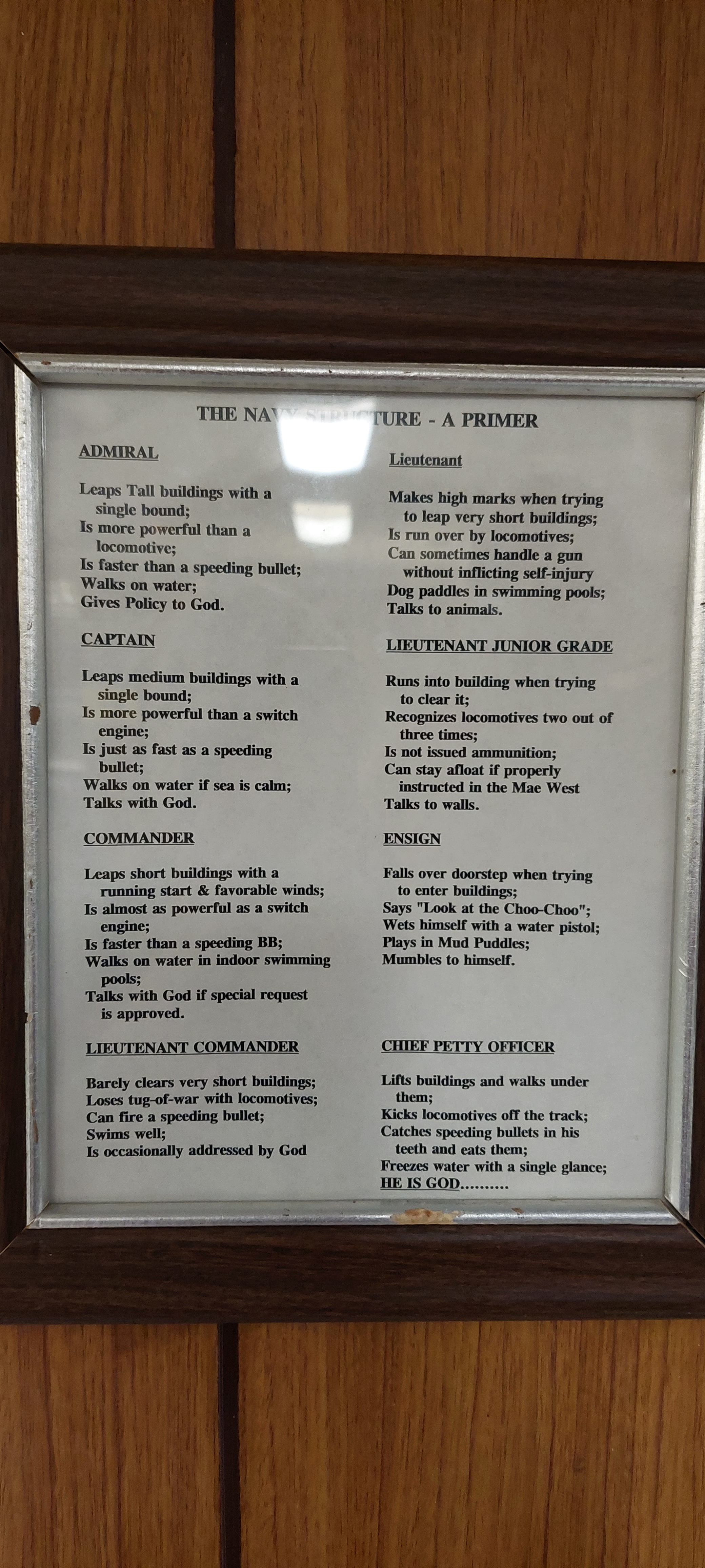 Our 2nd stop on the Trolley was near the USS Midway Aircraft Carrier. Of course we had to take the tour. Thought of my brother who was in the Navy for 25 years and served on several aircraft carriers, and other ships. Thank you to him and his wife (who was also in the Navy) and to all the others who served to protect us. Notice the Navy Structure- A Primer. Scott, is this true?