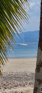 The main Tenacatita bay is much larger than the 1st one. This bigger one had 36 boats in it. It was very calm. We hardly moved at all. The swimming was great. There was one palapa on the beach that had cold beer and good food. There is a breakwater with some natural rocks and choral that had some excellent snorkeling.