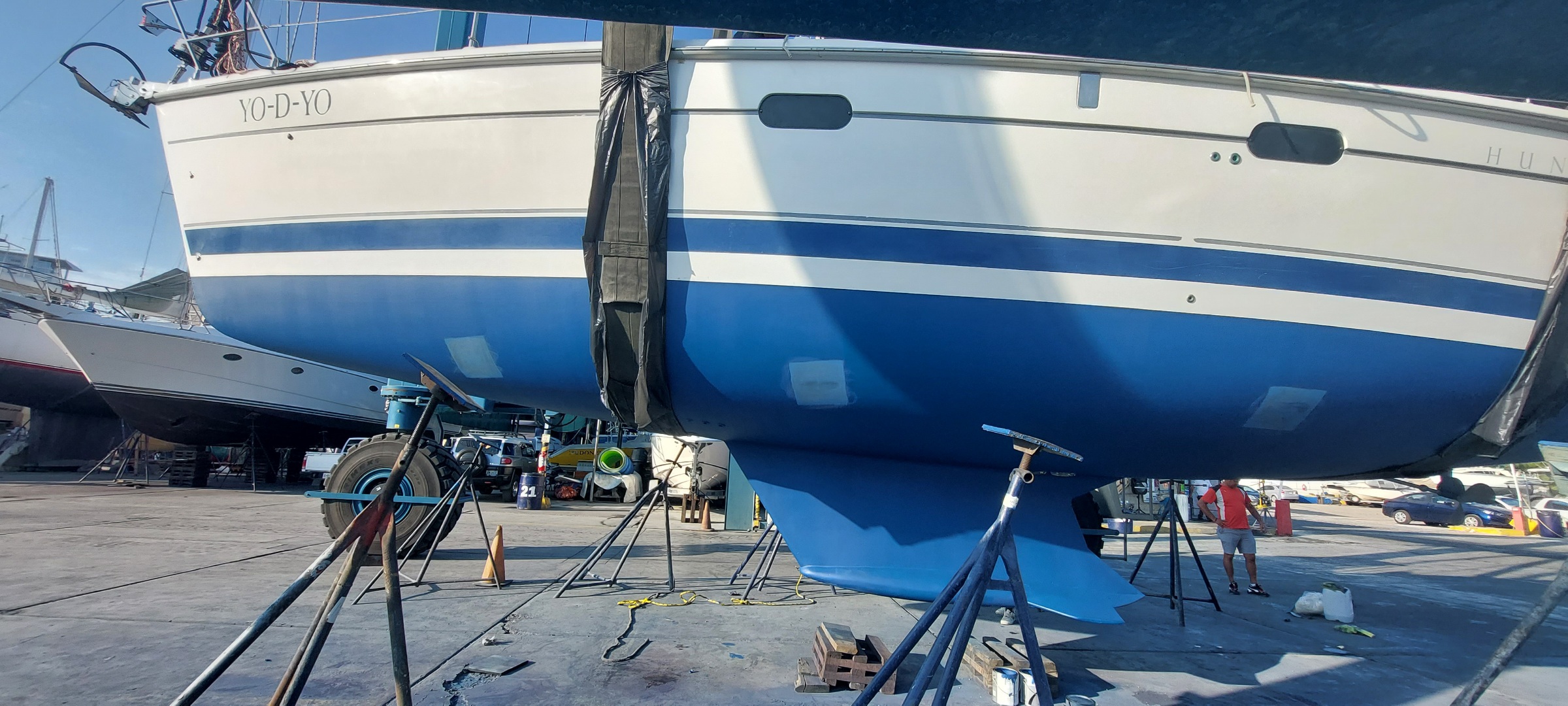 She is done! The ladt thi g they gad to do was put the sling back on and paint the spots where the supports were and the bottom of the keel. While it was on the supports, Dave took the opportunity to wax along the waterline. What a good man. I took the opportunity to get a pedicure. It only cost $12 US! A girl’s gotta do what a girl’s gotta do!