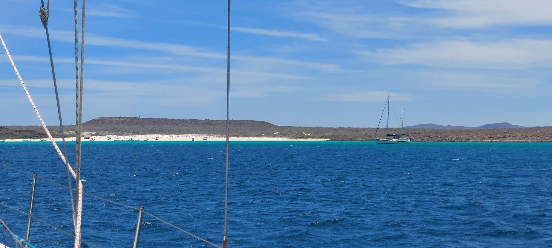 After we set anchor, Dave rowed the dinghy to shore and we walked the beach. We snorkled by the rocks by the beach but were a little disappointed because the water was a bit cloudy from the wind. We met a group of people from LA. They were excited for our adventure and gave us a beer while we told sea stories.