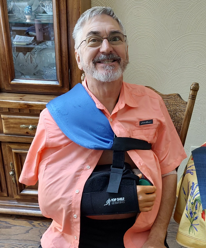 Rotator cuff surgery was done but weeks and months of recovery are in store. Ice packs and a lingering nerve block makes everything feel just fine. I hope Mary will be able to endure the attentive care that will be required.
