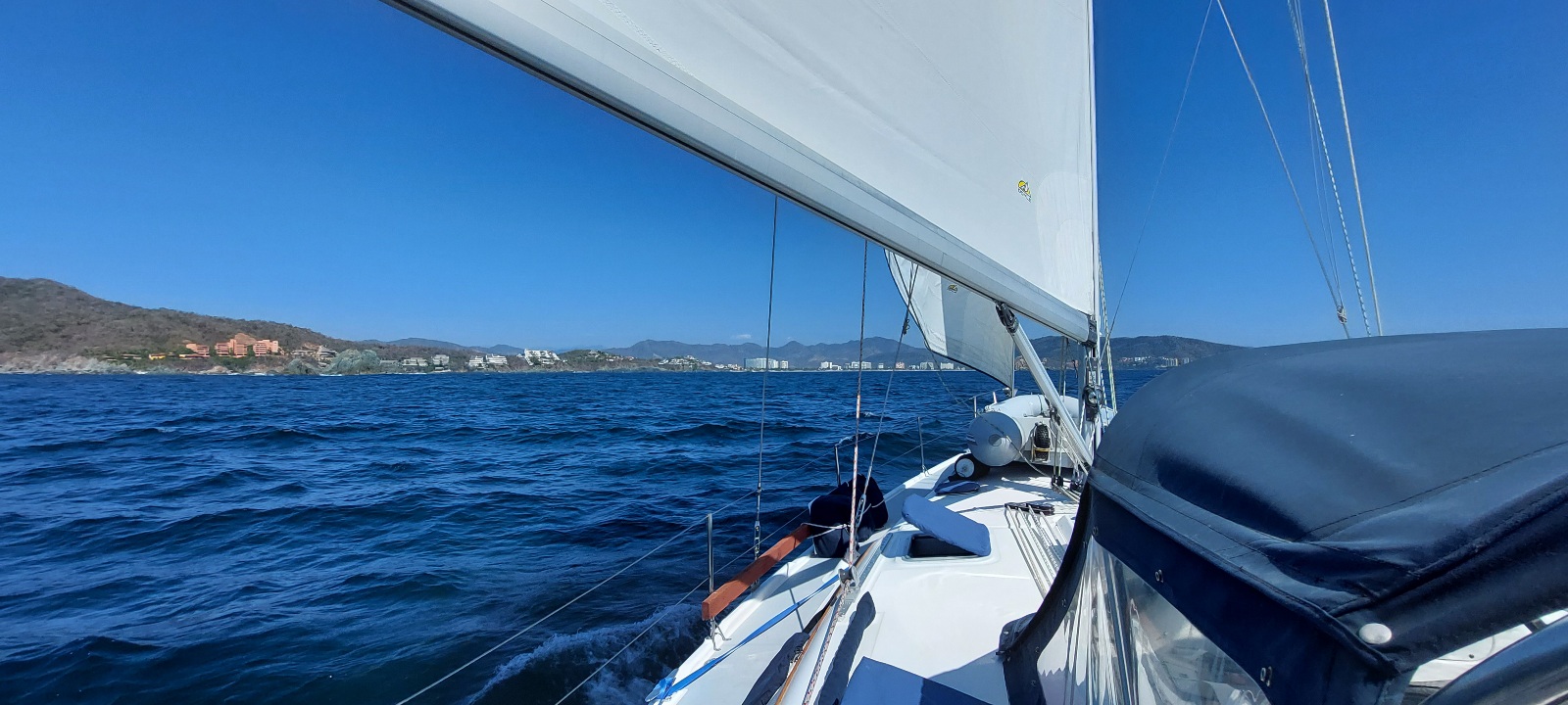 Yes, those are sails you see in the photo! We actually had nice wind on our 5-mile trip from Isla Grande to Ixtapa Marina. The channel going into the marina was very skinny and a bit shallow. We did not touch the bottom, so that was good.