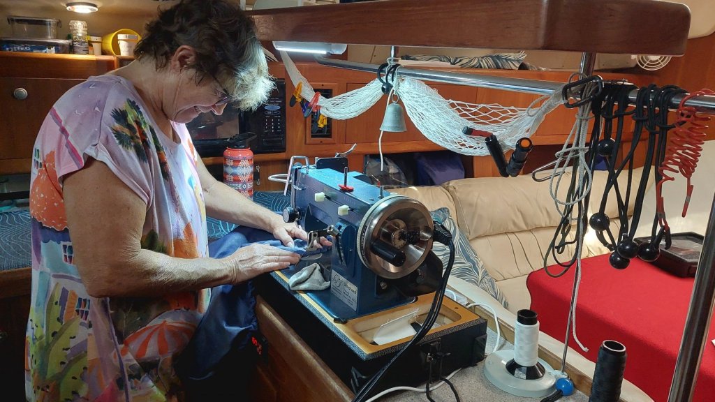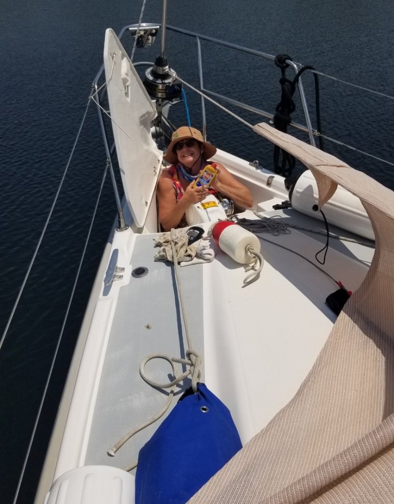 We are still working on our summer projects. Mundane stuff like stainless polishing and boat waxing. Mary’s up to some sewing projects. We have some sun and rain covers that need repairs and replacing before we leave the boat. The heat of the days makes for short hours on outside projects.