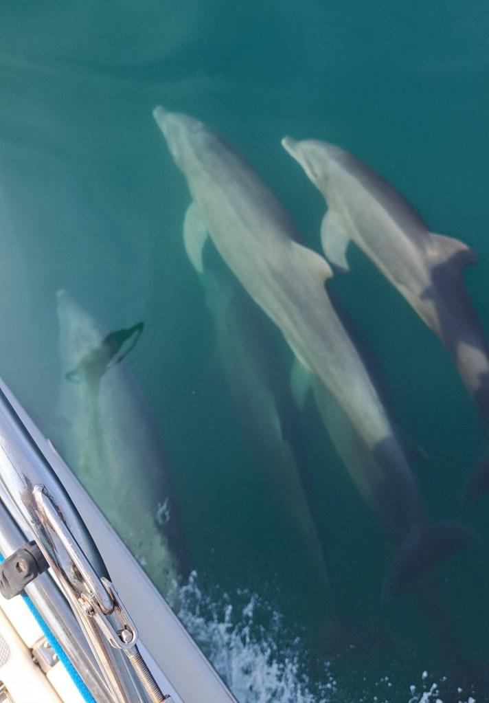We felt better about our passage when we were escorted out of the bay by dozens of dolphins. It reminded us why we do this. There were also some beautiful sunsets, and we had a full moon to help light our way, which made it much nicer.