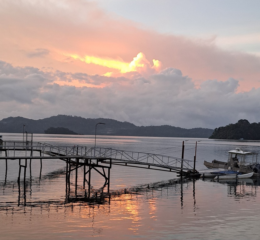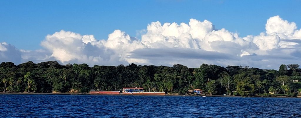 Our first night in Panamá was at a roadstead anchorage rather than in a nice protected bay. Several other boats had been here before and said it was great. The only drawback was the very irregular bottom going from 200 feet to 10 feet very unevenly in the last quarter mile. Our boat is the little red triangle. The chart says we are on the beach, but I’m sure we anchored in about 25 feet of water.