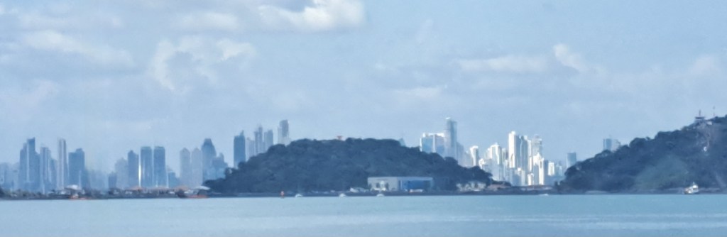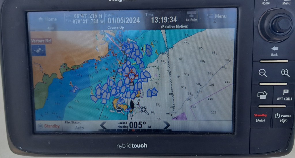 As we approached our destination, we also had to navigate through the mass of ships at the canal anchorage. There is a backlog of ships waiting to go through the canal. A water shortage in Gatun Lake has reduced the number of ships being allowed through each day.