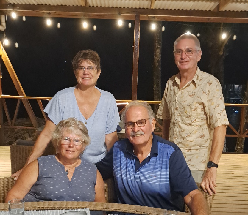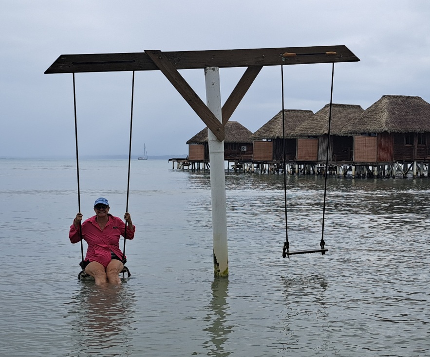 Day two.  On shore is a little hotel, Azul Paradise.  We took our dinghy in to visit the hotel the next morning.  The hotel is only accessible by boat.  They have little huts over the water for guests and two restaurants for anyone who shows up.  Our friends, Don & Roz, sailed in so we went in later for dinner.  Three of us had seared ahi tuna while the fourth enjoyed filet mignon.  Boat life.
