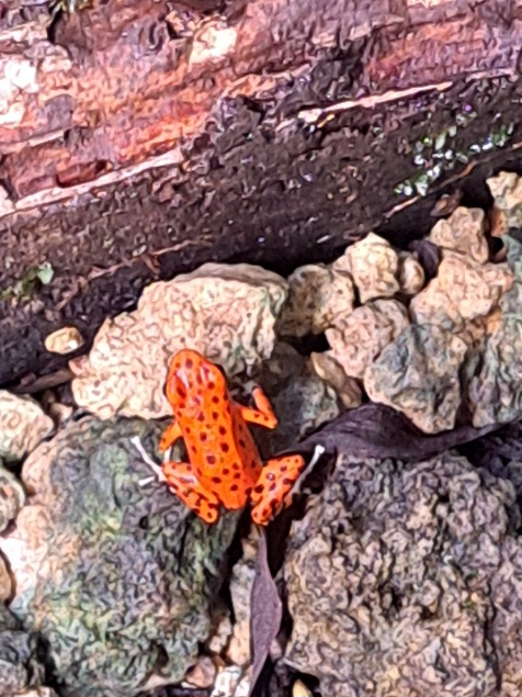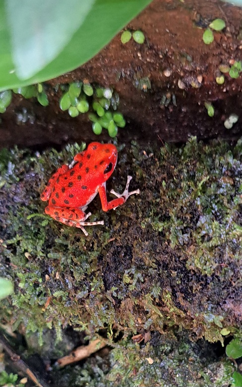 I started by walking on a trail through the jungle. It was a rainy day so the water was flowing in the creek near the trail. The red frogs must love the rain because I saw about 10 of them. There was a small creek near the trail and there were several small waterfalls. After awhile I saw the spa building. It had a porch with 2 massage tables on it, a changing room, and a supply room. It was amazing.