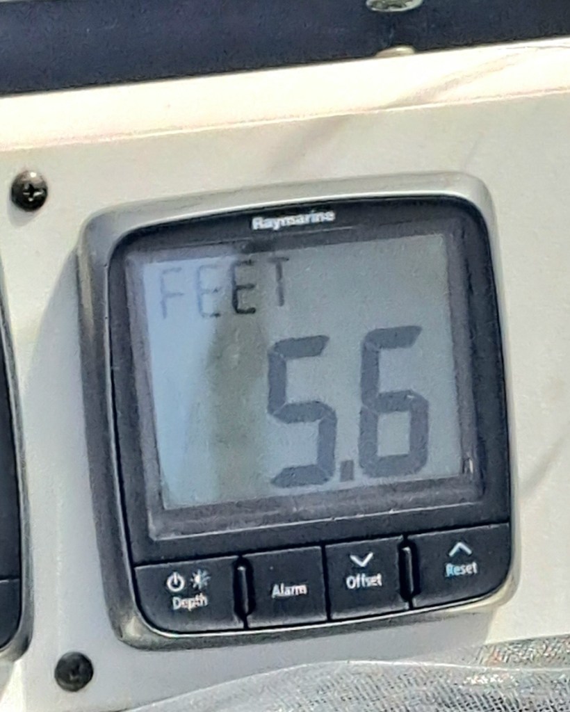 We started early to catch the river currents heading to the sea.  Just a bit into the motor, Mary checked our dripless shaft seal.  It was more than dripping at 2000 RPM.  so we throttled back, slowed down, stopped most of the water intrusion, and continued on a bit slower than planned.  We put out the headsail whenever possible to make up for the lower RPM’s.